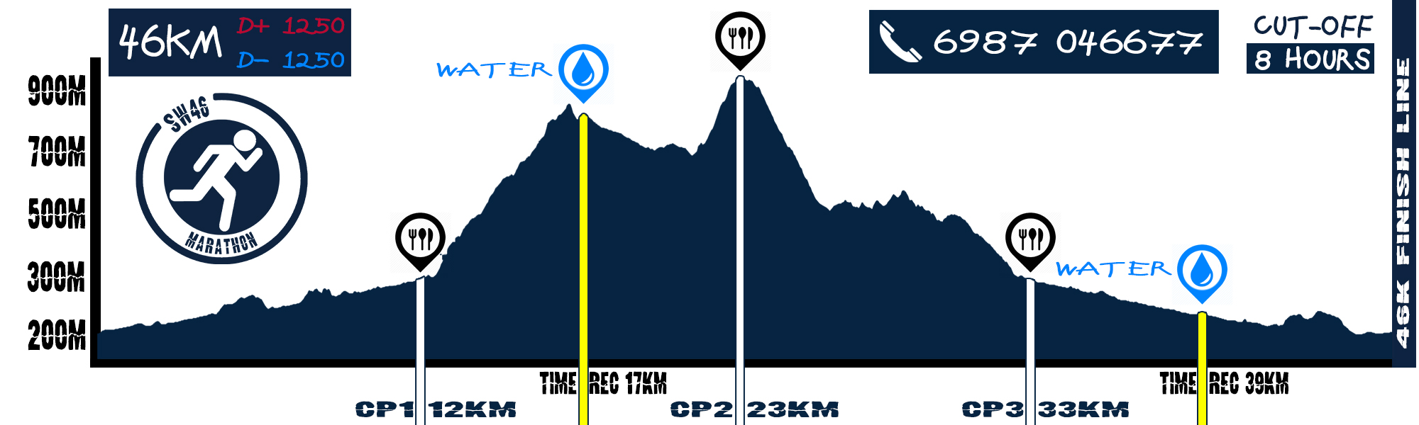 ΓΕΝΙΚΑ: Ο #SW46 (MARATHON) αποτελεί τον "μαραθώνιο" αγώνα της διοργάνωσης μήκους 46χλμ και D+ 1.250μ θετικής υψομετρικής διαφοράς. Η διαδρομή (όπως και του αγώνα των 100χλμ) είναι όλη σε μονοπάτια/χωματόδρομους με εξαίρεση τα τελευταία μέτρα τερματισμού τα οποία θα κινηθούν σε άσφαλτο εντός της πίστας 69 Speedway. Η εκκίνηση θα δωθεί την Κυριακή 07/ΑΠΡΙΛΙΟΥ/2024 απο την πίστα καρτ.